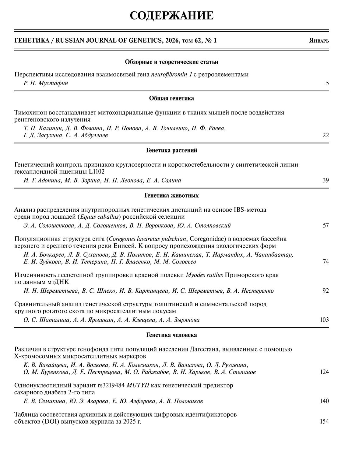 Статьи, опубликованные только в Russian J. of Genetics, № 1 – 2026 г.